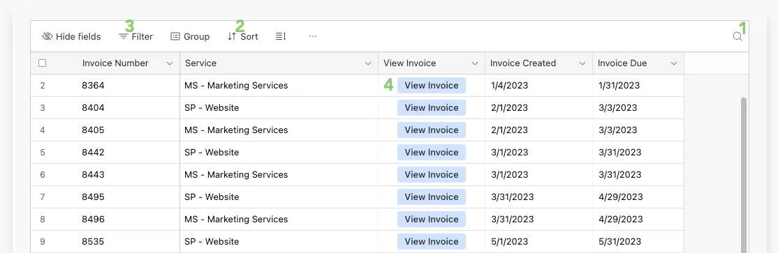 On the Invoices & Documents/Resources page, you will see a list of your invoices. You can (1) Search, (2) Sort, (3) Filter, and (4) View.