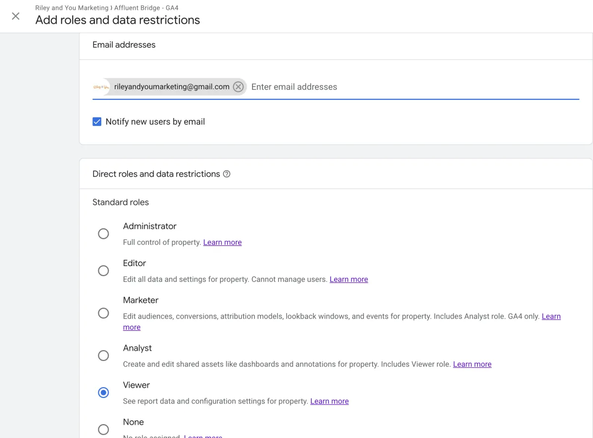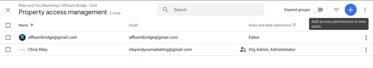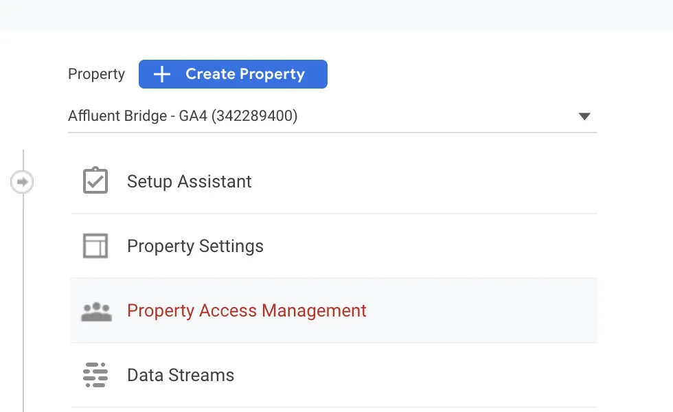 Select Property Access Management under PROPERTY (Make sure if you have multiple properties, that the correct GA4 property is selected from the dropdown).