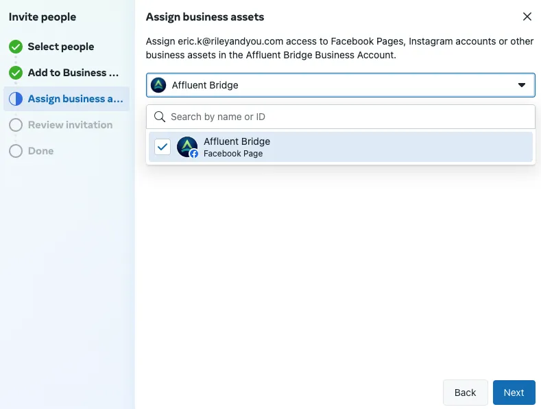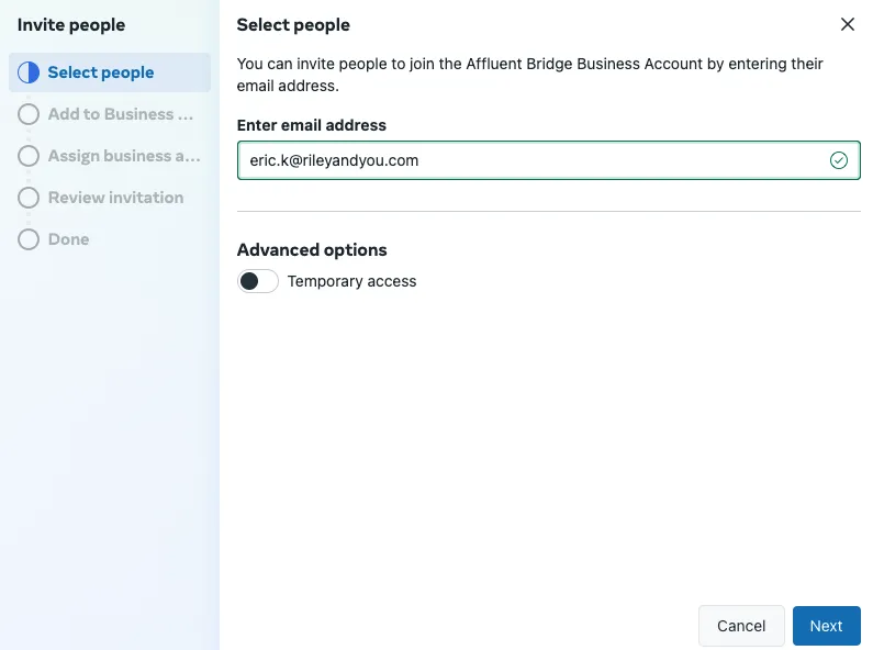 Many of our digital accounts use our primary business name Riley & You. You may be asked to grant access to either Riley & You or AffluentBridge™, depending on the platform. The following processes will allow us the access necessary to run Facebook and Instagram advertisements for your business.