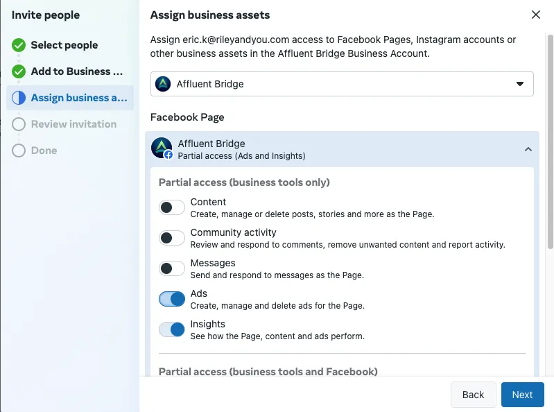 Select the Page to expand the dropdown menu and choose the boxes for Ads and Insights. Select Next.