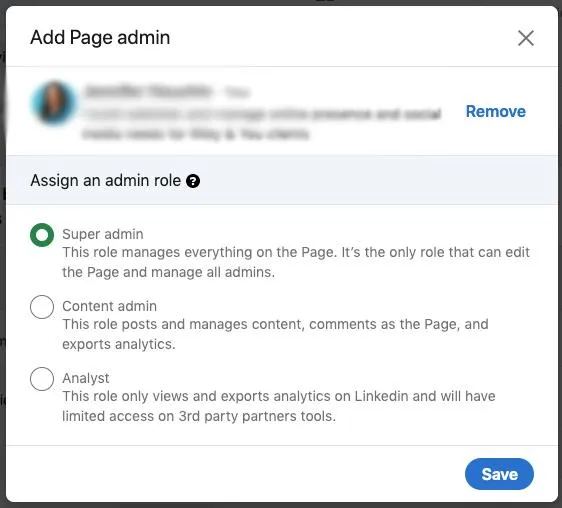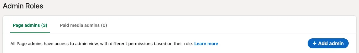 LinkedIn Page super admins can add, edit, or remove page and paid media admins through the Super Admin View or an email notification process. The instructions below detail the basic adding of a new admin. Additional instructions can be found directly within the LinkedIn help pages.
