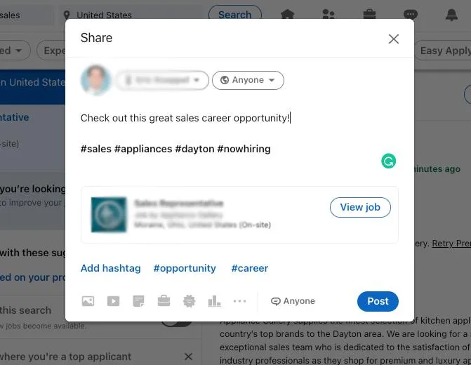 Select the job posting you would like to share from the left-hand side and then click the “Share” button to the right of the job title. Select “Share in a post” to post the job to your personal LinkedIn profile.