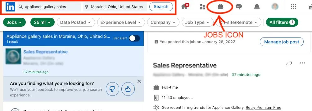 Log into your LinkedIn account and select the Jobs icon on the toolbar at the top of the page. Proceed to type the business name and position into the search bar, followed by the job location.